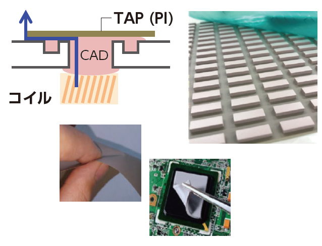 ●チップレットモジュールのシステムレベルテスト ●繰り返し圧縮する熱伝導シート ●軽量化が必要な発熱体 |
