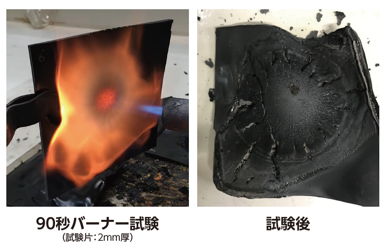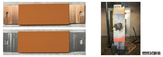 ●材料技術:絶縁性が高く、薄膜化に貢献します。熱硬化樹脂で耐熱性に優れ、燃焼時の雰囲気温度で溶けません。無機物を多く含み、燃焼後に絶縁性のチャー層が形成できます。