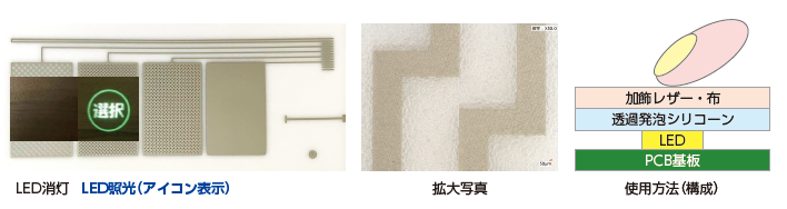 ●材料技術:シリコーン基材の厚み・発泡率・発泡の大きさをコントロールができます。光が効率的に拡散し、照光の均一性と品位が高まります。 |