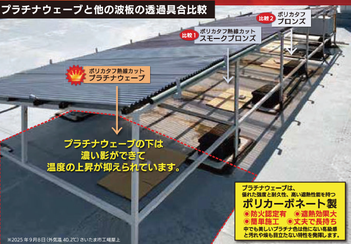 プラチナウェーブは、優れた強度と耐久性、高い遮熱性能を持つポリカーボネート製ナミイタです。