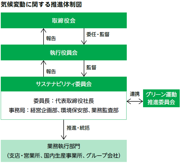 当社グループは、代表取締役社長を委員長としたサステナビリティ委員会を設置し、CO₂排出量削減目標等、気候変動対応に関する審議や、業務執行部門で行われる各年度の活動報告等を定期的に受けるなど、サステナビリティ経営のさらなる強化のために必要な議論を行っています。当委員会で議論された重要な事案に関しては、執行役員会、取締役会に報告しています。取締役会はこれらの報告をもとに対応状況を監視・監督しています。また、継続的に取り組んでいる省エネ活動としてのグリーン運動では、国内外の生産事業所で掲げている目標の進捗報告を定期的に行っています。2023年度に策定したロードマップに従い、2024年度は国内5工場で10%の再エネ電力に切り替えました。11月に委員会にて6カ月間のモニタリング結果を共有し、ロードマップの見直しを審議しました。その結果、2025年度に向け国内5工場で20%の再エネ電力の導入を決定しました。海外生産事業所においては、2025年度以降に再エネ電力の導入を予定しています。