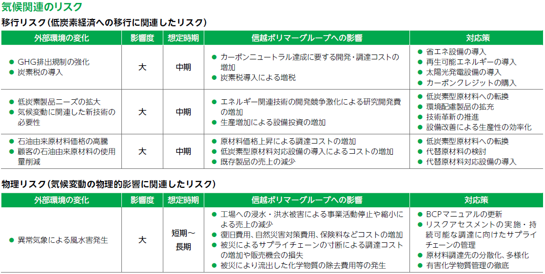 シナリオ分析の結果、GHG排出規制の強化や炭素税の導入など法規制の変更に伴う移行リスクと風水害の発生など異