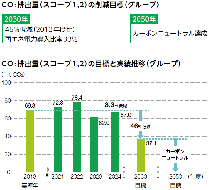 当社グループでは、スコープ1,2について2050年までのグループ全体のCO₂削減目標を設定しました。今後は省エネ設備の導入や再生可能エネルギーへの転換など積極的に推進します。スコープ3は排出量の多いカテゴリに対し優先的に削減目標の設定を検討しています。また、2030年の再エネ電力導入比率の目標値を設定しました。