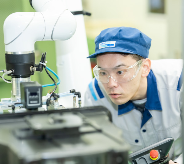 半導体向けの製品の生産技術に従事しています。具体的には、製品を組み立てる装置の導入や、ロボットによる自動搬送の仕組みづくりなど、生産ラインの自動化・省人化を進める仕事です。導入した装置のトラブル対応や改良も担当しています。生産ラインがまだ何もない状態から、自分の頭の中で構想を描いて、装置や設備を形にしていく。その「考える楽しさ」がこの仕事の一番の魅力ですね。実際に装置を導入して、それがうまく機能したときはとても嬉しいです。